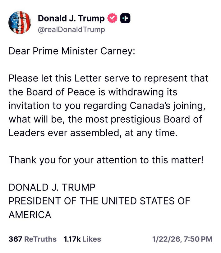Carney’s speech upset *rump enough that he rescinded his offer to Canada to join his “Board of Peace.” Heh. Bored of Peace is more like it. The idea of *rump presiding over a “Board of Peace” is almost laughable. Why would any country consider joining up with this doddering old fool? The NYTs writes that this organization is an attempt to create a rival to the United Nations — but with Mr. Trump firmly in charge. The document said Mr. Trump would have veto power over many of the board’s decisions, and it asked countries to contribute more than $1 billion in exchange for a permanent seat. Again, coercion. Pay me and I’ll include you, but I’m in charge. Pretty good racket.