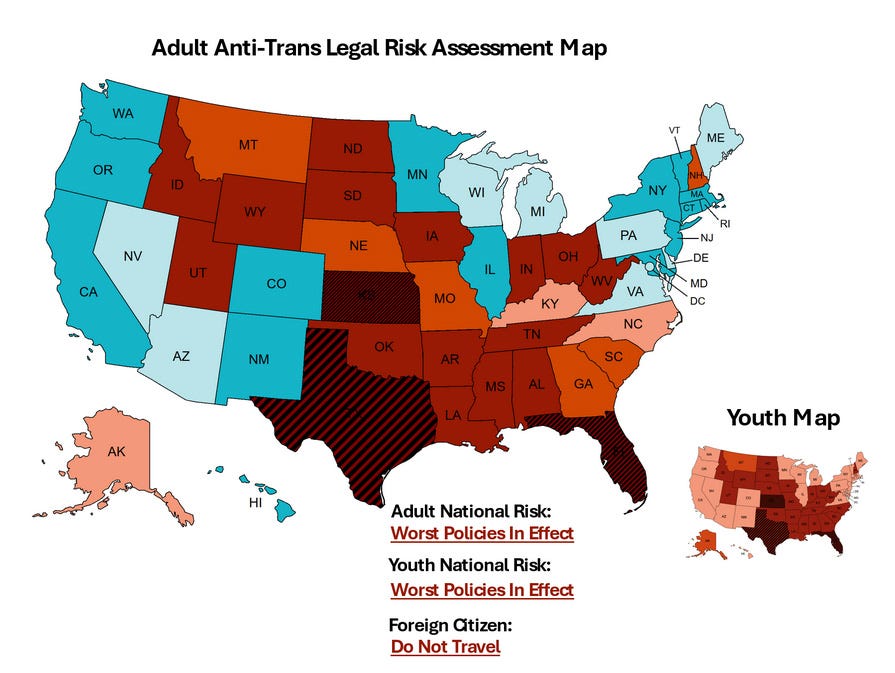 As a result of this extreme anti-transgender law, the state of Kansas has seen its status deteriorate to a “Do Not Travel” warning in the EITM Trans Risk Map. Transgender people should exercise extreme caution when traveling through the state, and those already living there should take immediate steps to legally protect themselves in the face of laws that could strip their driving privileges, expose them to criminal penalties, and subject them to thousand-dollar bounties simply for using a restroom. For most transgender people who do not already live in Kansas, the risk is now too great to travel there at all.
