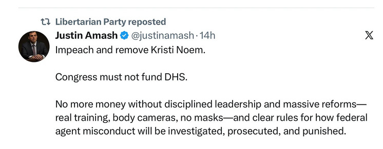 Even the fucking Libertarian Party has condemned Noem, and Kuo goes on to write that even the NRA, which is supposed to be there precisely to stop the government from disarming and killing citizens, finally came out with a statement condemning the claim that law enforcement is legally justified in shooting you simply because you approach them with a gun. (Pretti was licensed to carry his firearm, and Minnesota law permits people to have one on their person while in public.)
